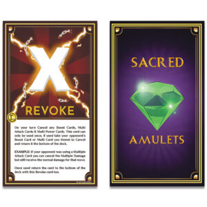 The Sacred Amulets Playing Cards feature completely custom artwork in every aspect of the design, play a one vs one battle, Sacred Duo or Sacred Trio battle.