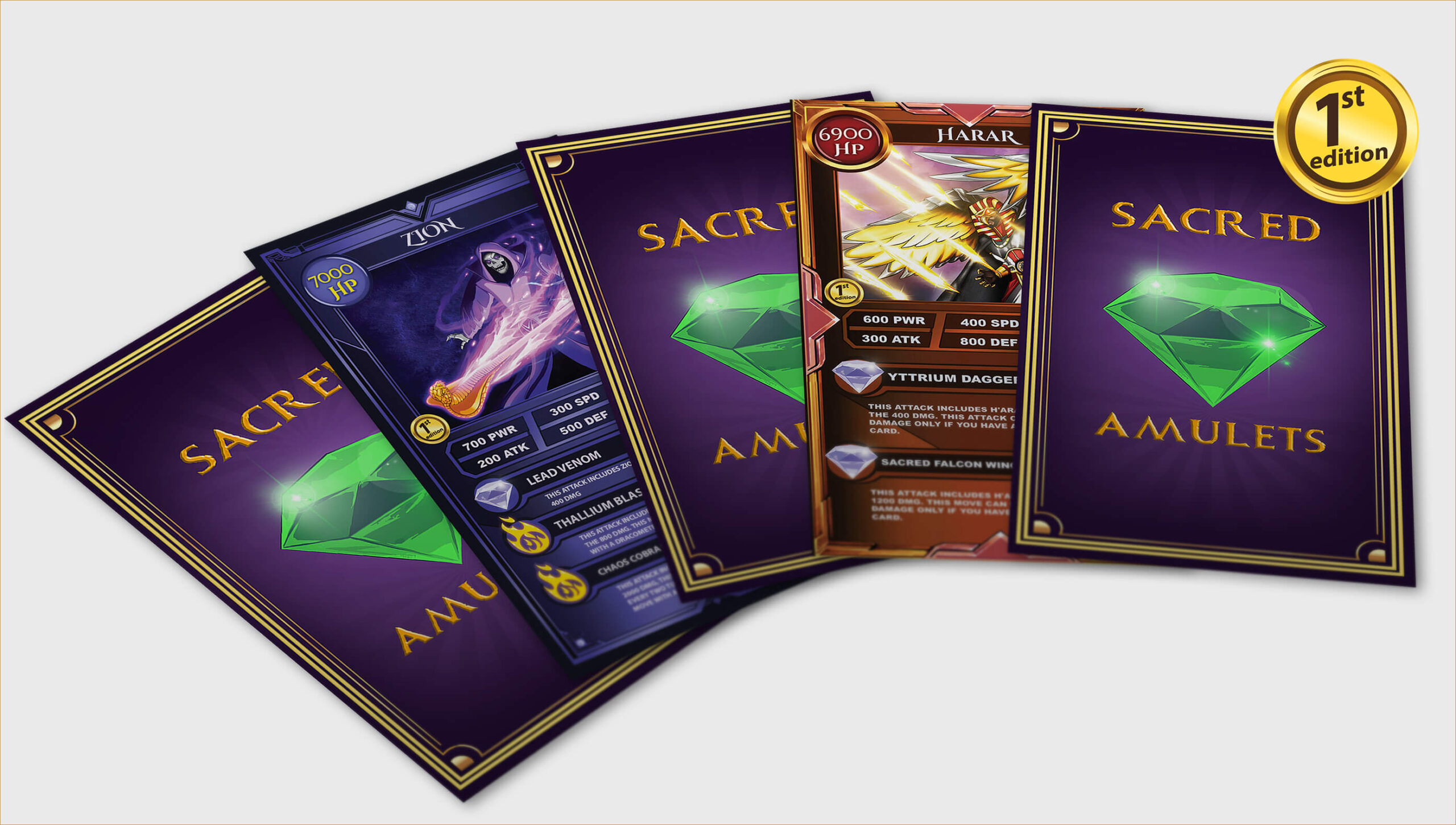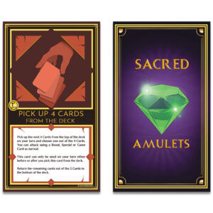 The Sacred Amulets Playing Cards feature completely custom artwork in every aspect of the design, play a one vs one battle, Sacred Duo or Sacred Trio battle.