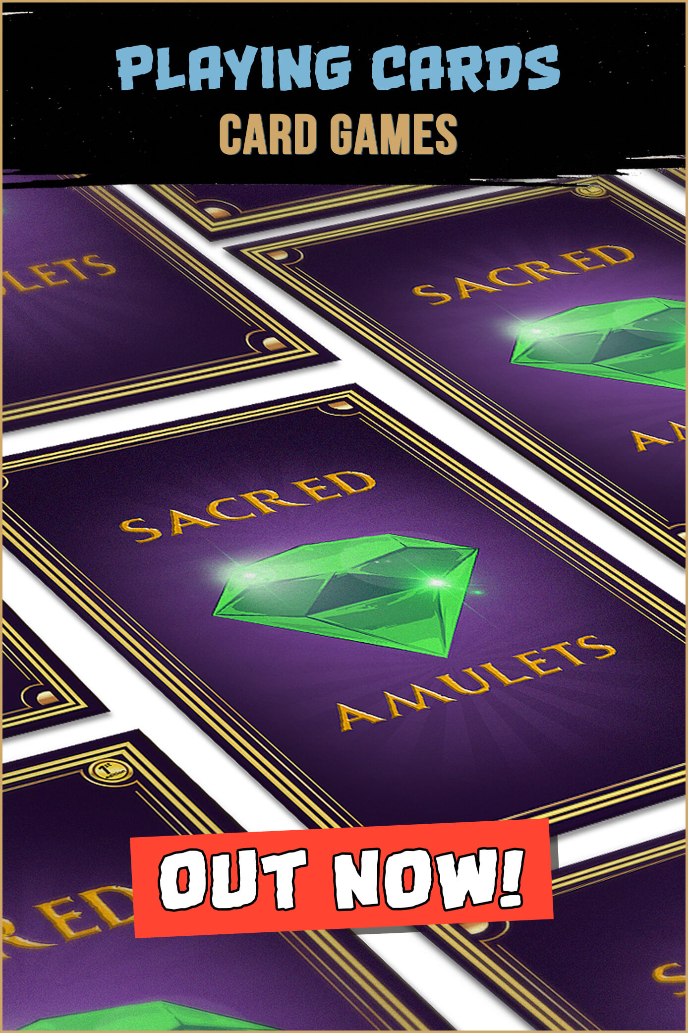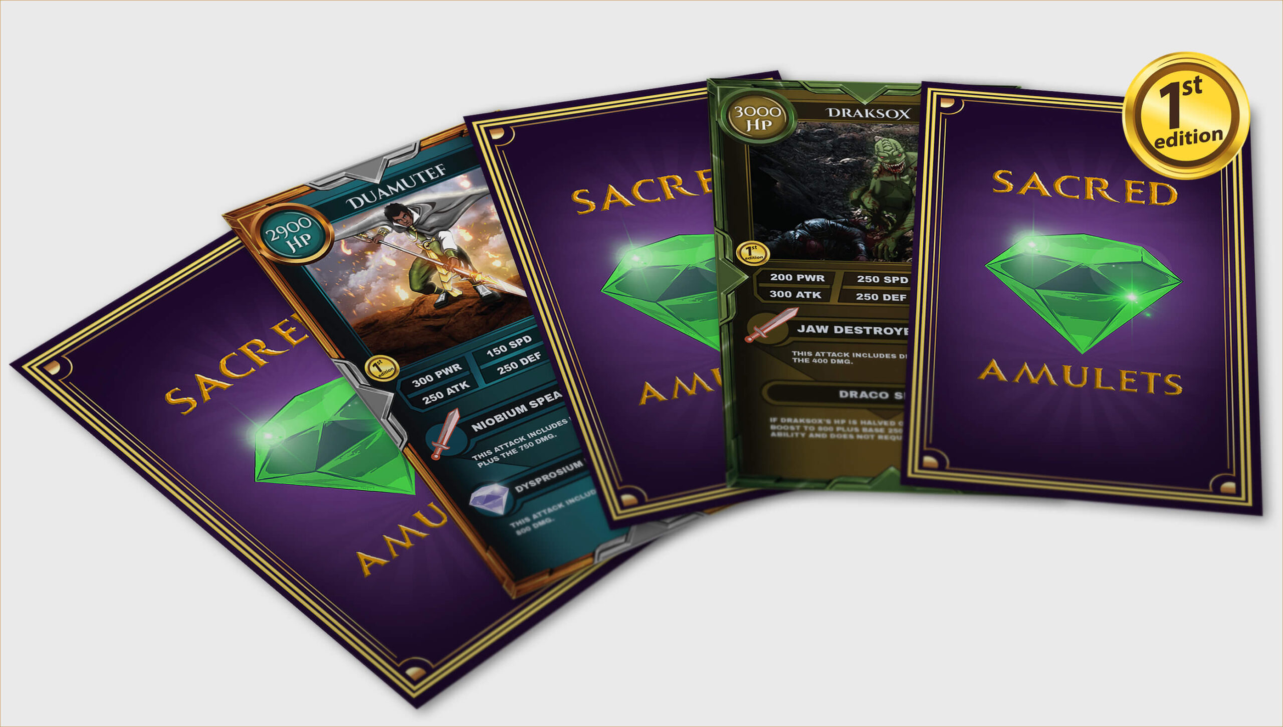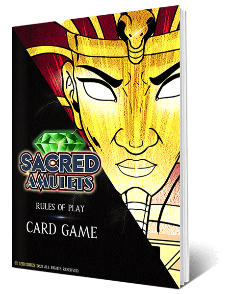 The Sacred Amulets Playing Cards feature completely custom artwork in every aspect of the design, play a one vs one battle, Sacred Duo or Sacred Trio battle.